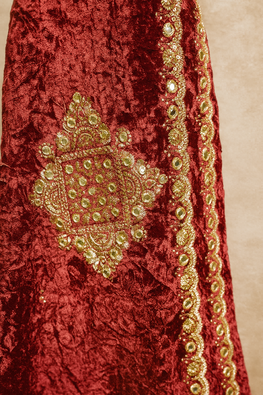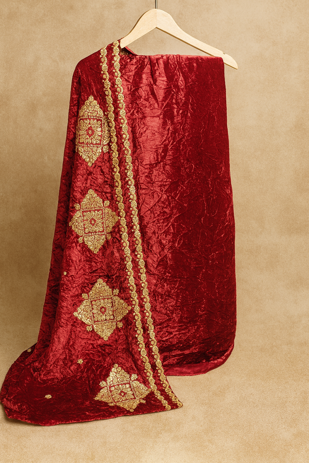 Enhance your festive wardrobe with this luxurious crimson red velvet dupatta, beautifully adorned with bold gold zari embroidered motifs and a finely crafted scalloped-style border. The crushed velvet texture adds richness and depth, making it perfect for weddings, celebrations, and traditional events. Pair it with matching or contrasting suits for a regal, eye-catching look that radiates elegance and sophistication.