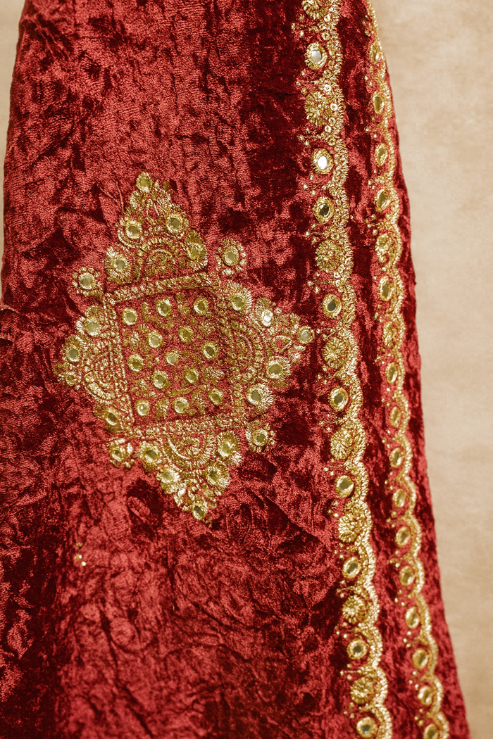Crimson Red Velvet Suit and Dupatta with Heavy Gold Zari Embroidery