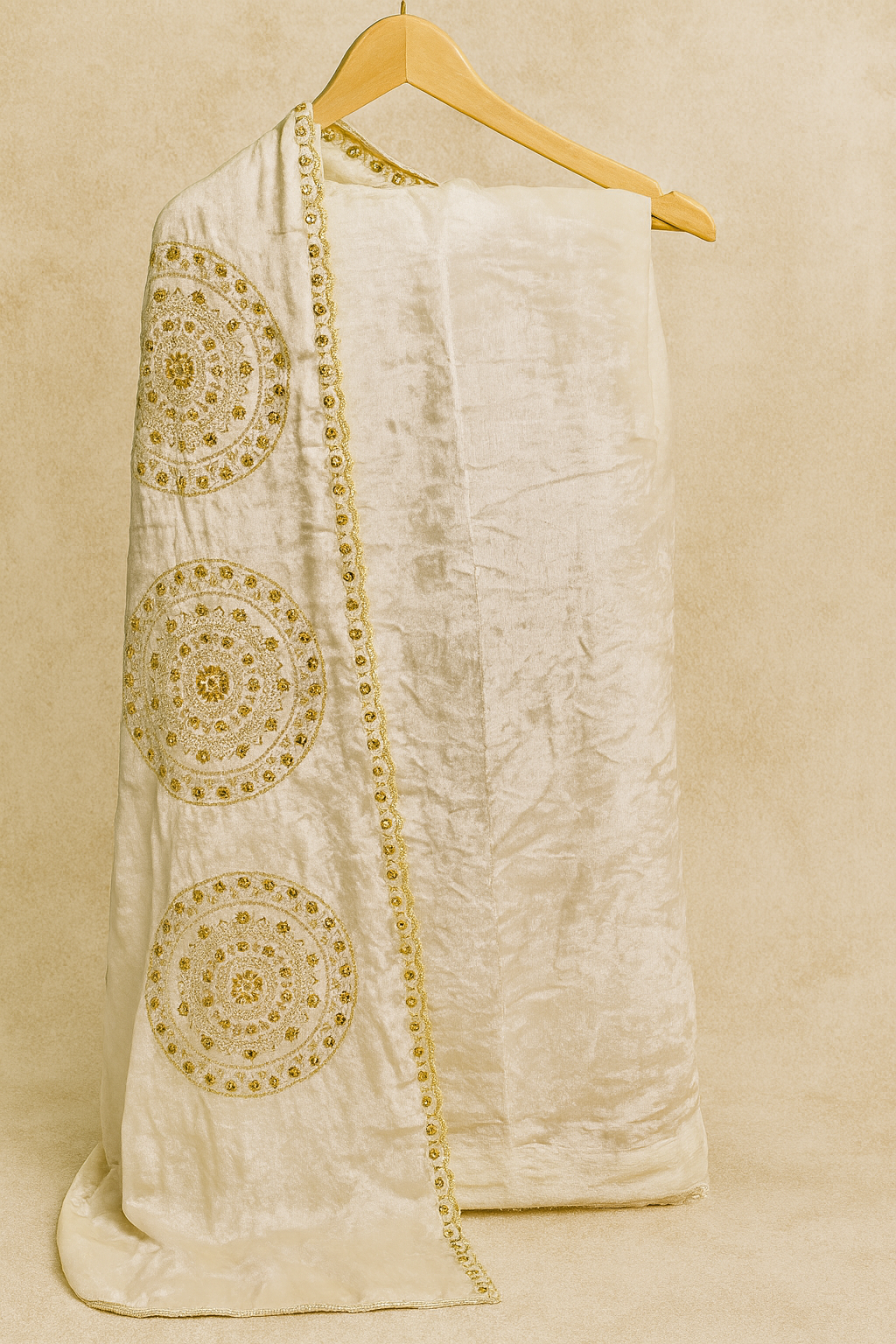 Grace your ethnic wardrobe with this stunning ivory white velvet dupatta, beautifully embellished with intricate gold mirror work and fine thread embroidery. The large circular motifs and delicate border detailing add a rich, festive charm, while the soft velvet fabric enhances its luxurious feel. Perfect for weddings, engagements, festive events, and elegant celebrations, this dupatta pairs effortlessly with pastel, gold, or contrasting suits for a timeless, royal look.